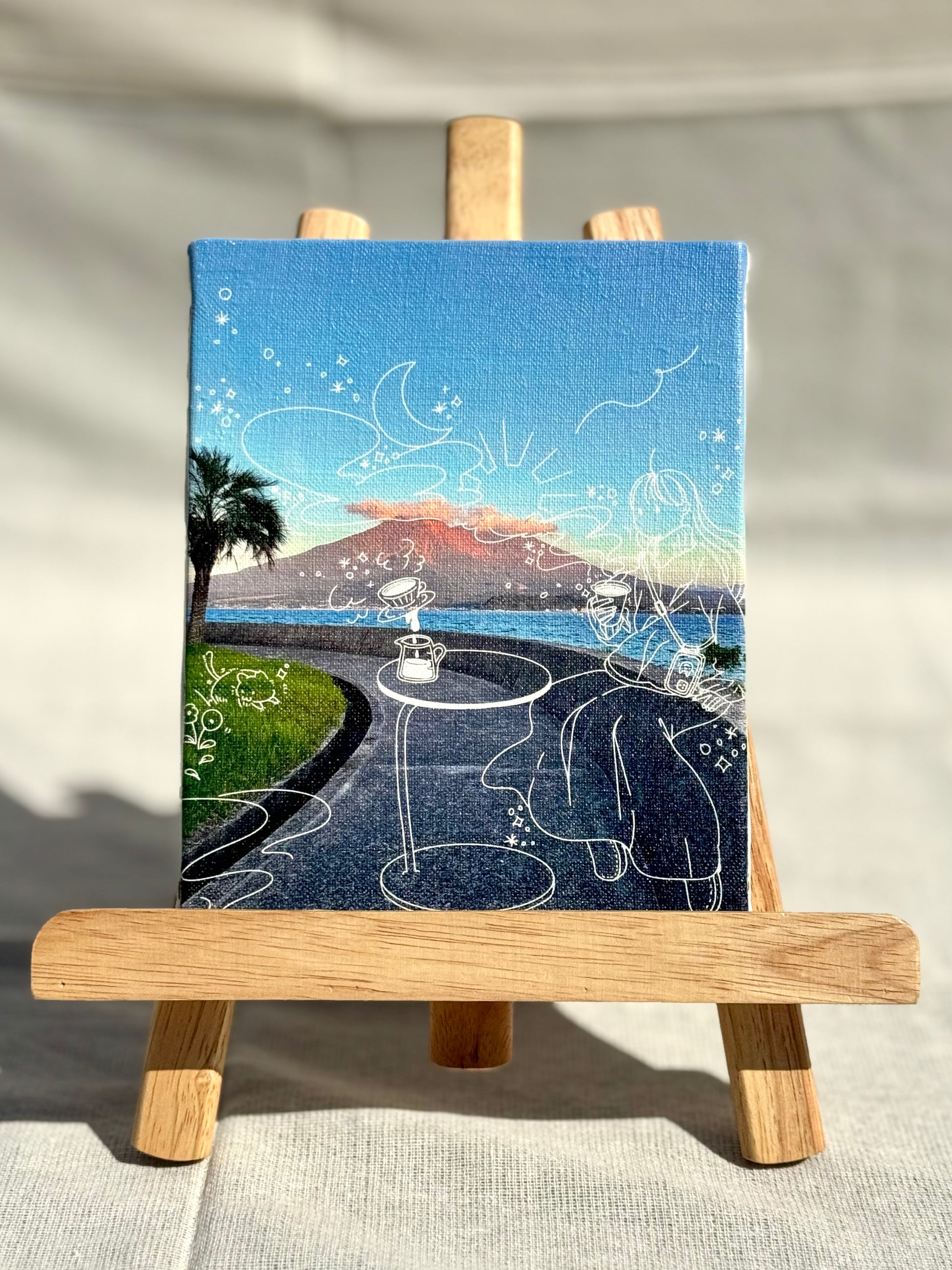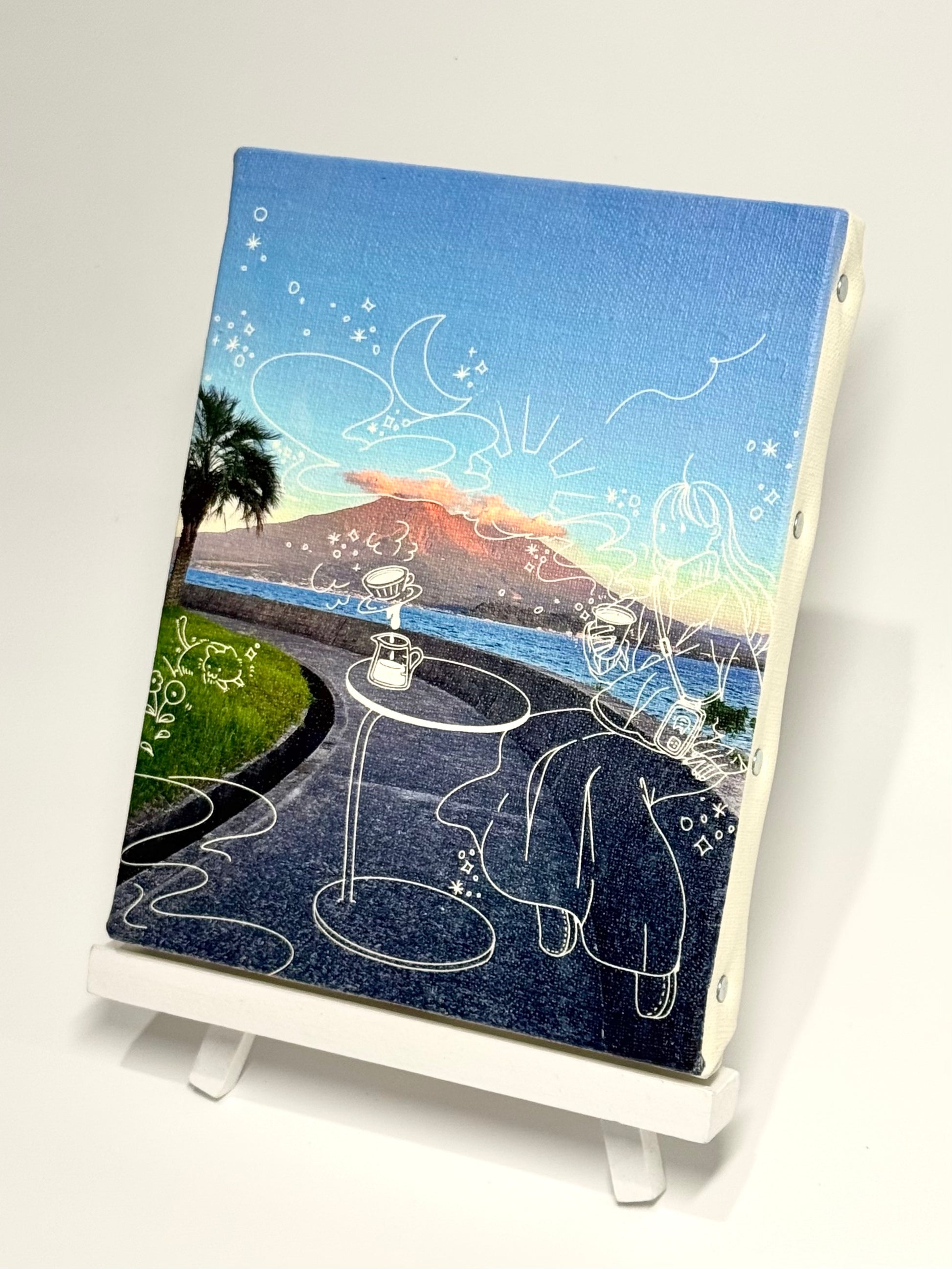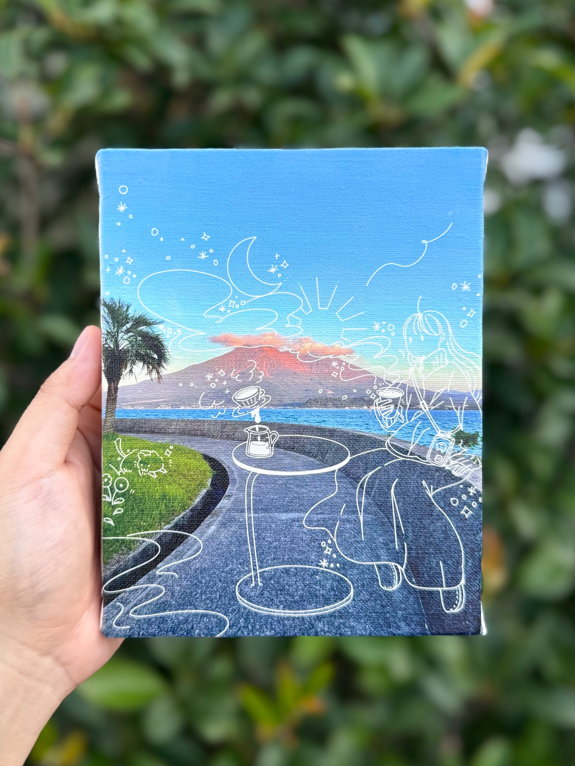 夕陽に照らされ赤く染まった美しい桜島を背景に、潮風を浴びながら鹿児島のゆったりとした空気に浸る女の子のイラストを重ねました。お部屋に癒しを添えてくれる一枚です。