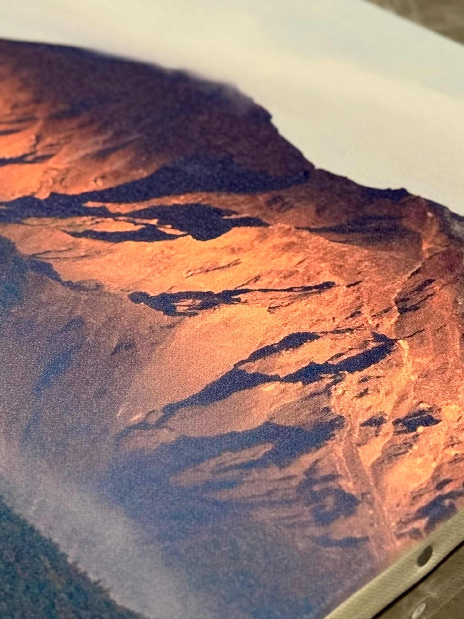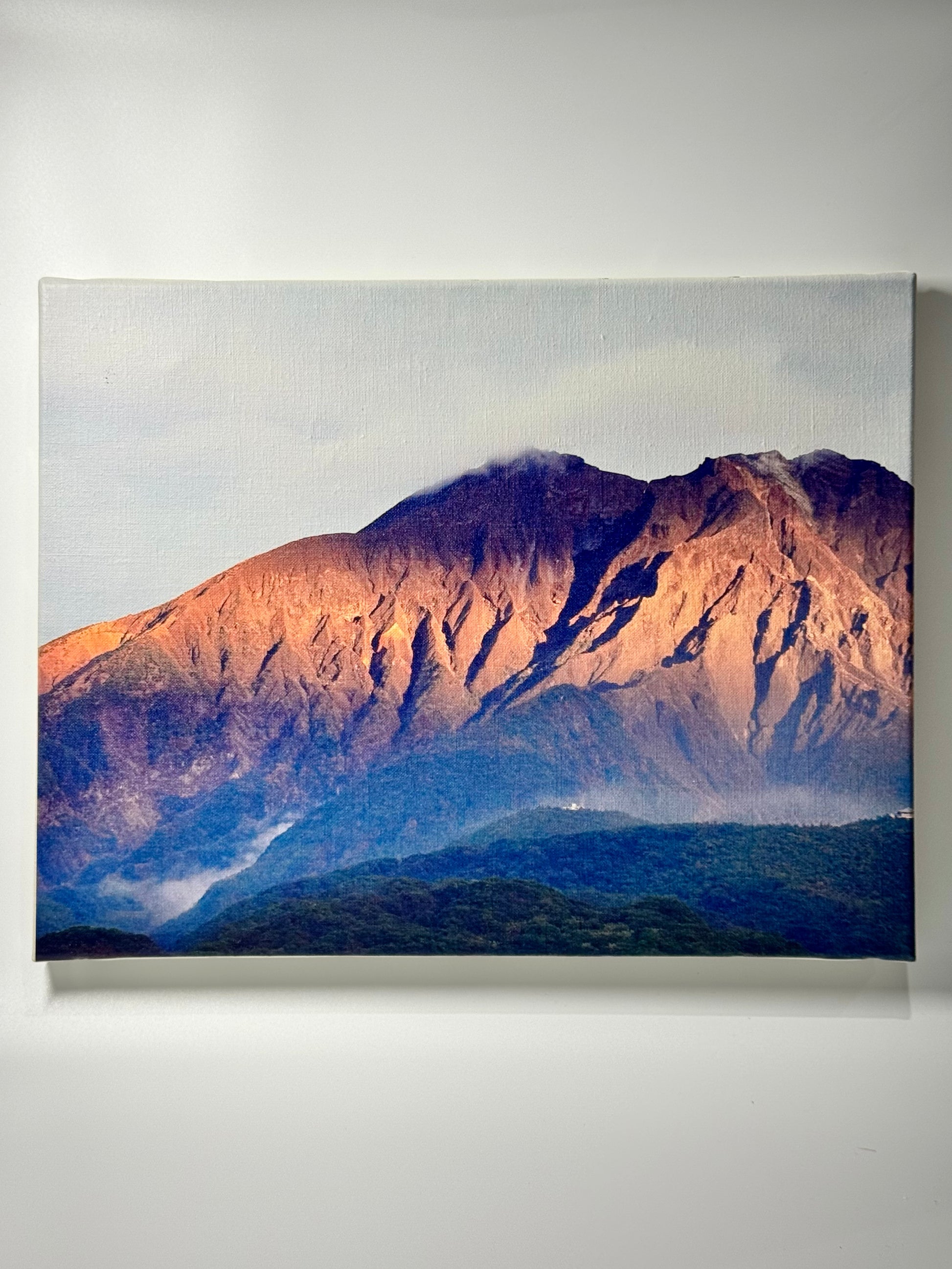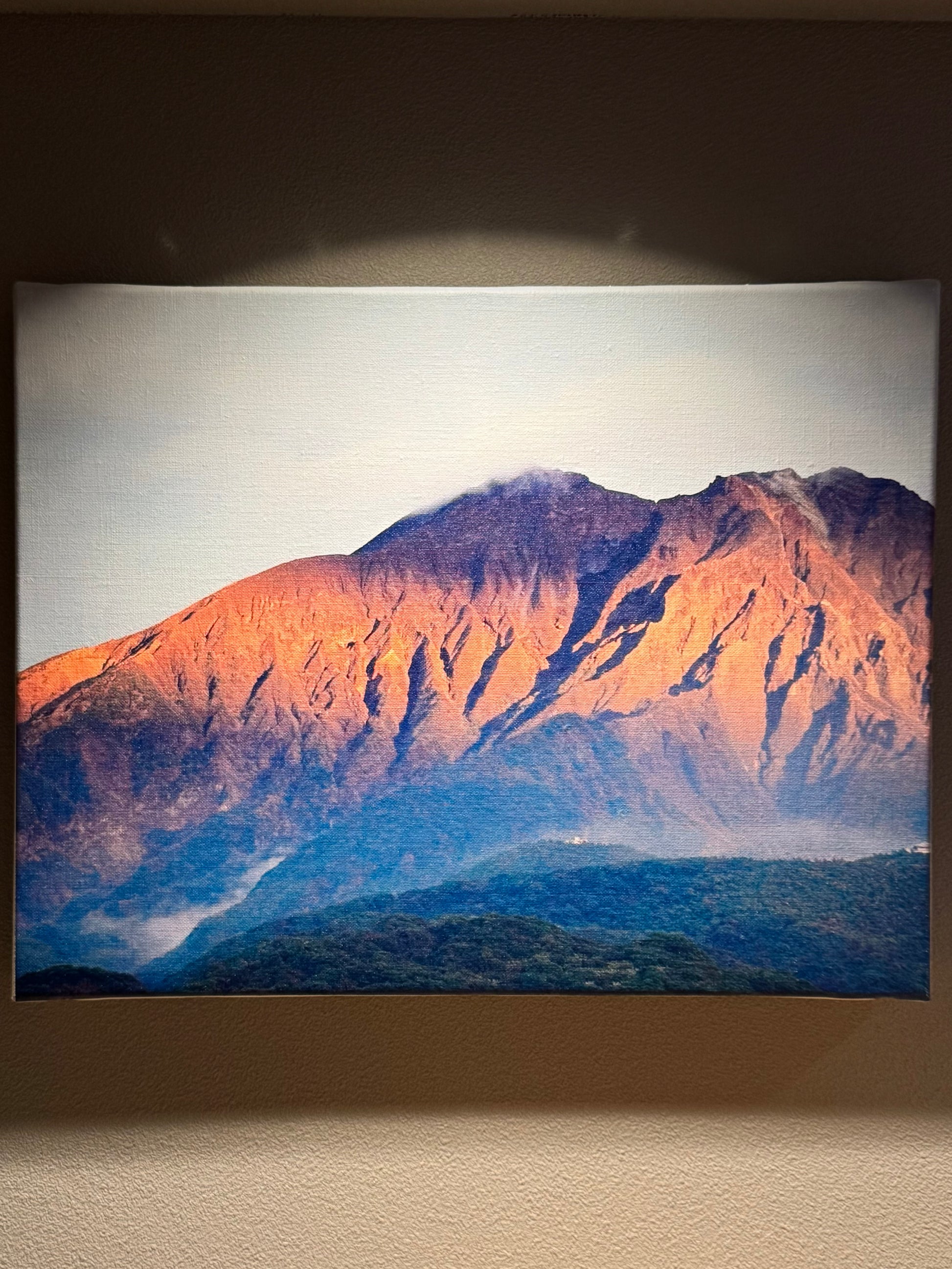 夕陽に照らされ、赤く染まる桜島。雲間から差し込む光が、荒々しさと美しさを同時に映し出した一枚です。力強い存在感が、空間をドラマチックに彩ります。