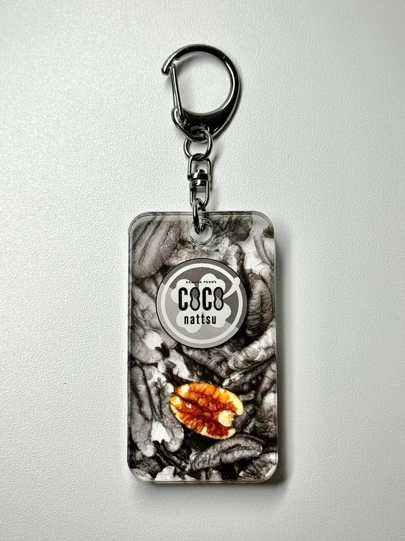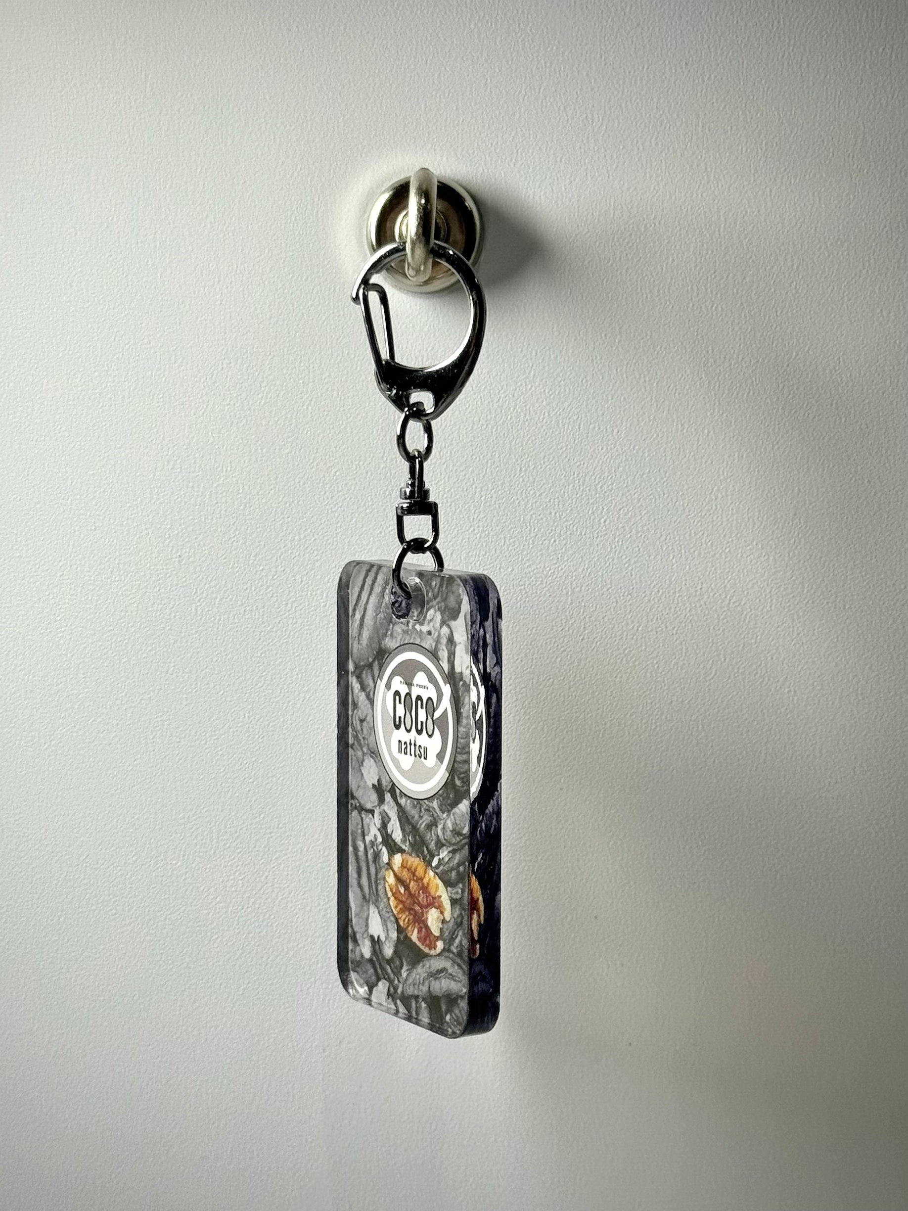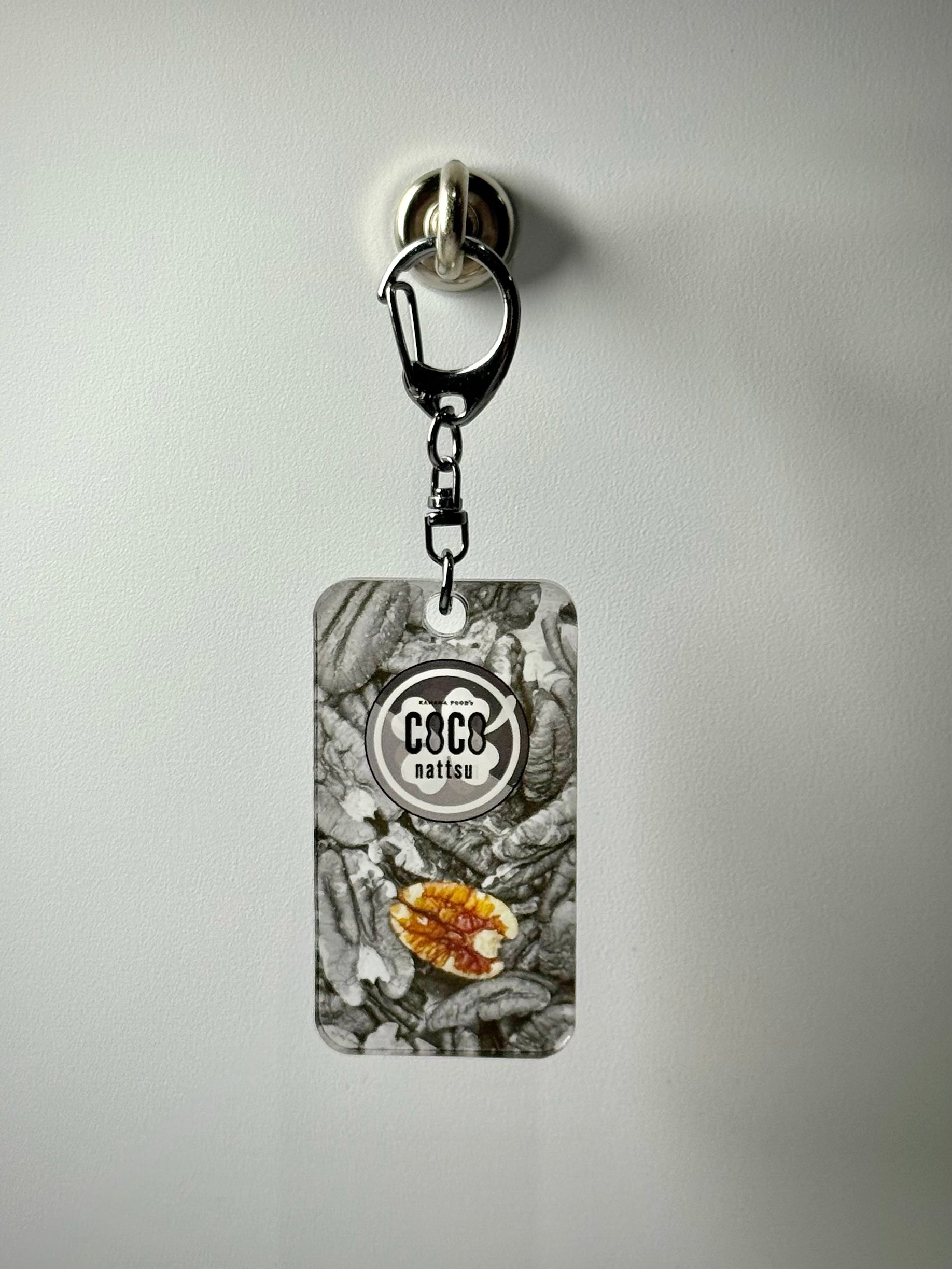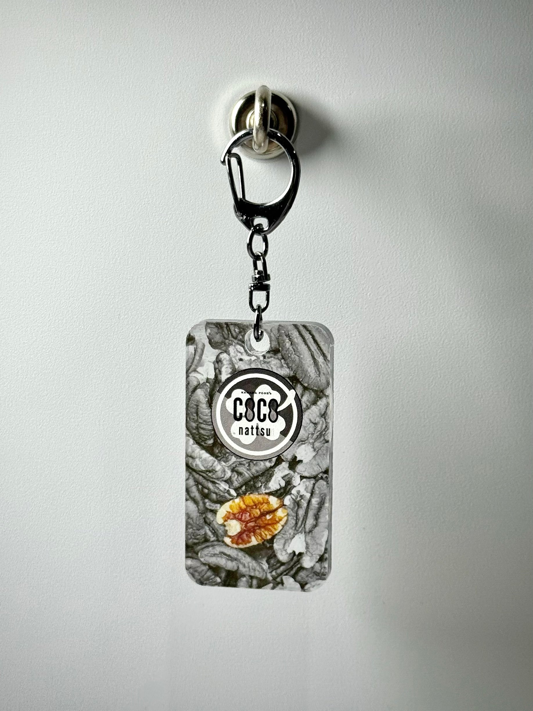 程よい厚みで高級感のあるアクリル素材を使用。美しい透け感と、ピーカンナッツをそのまま閉じ込めたようなデザインが印象的です。バッグや鍵などにアクセントを添えることができます。