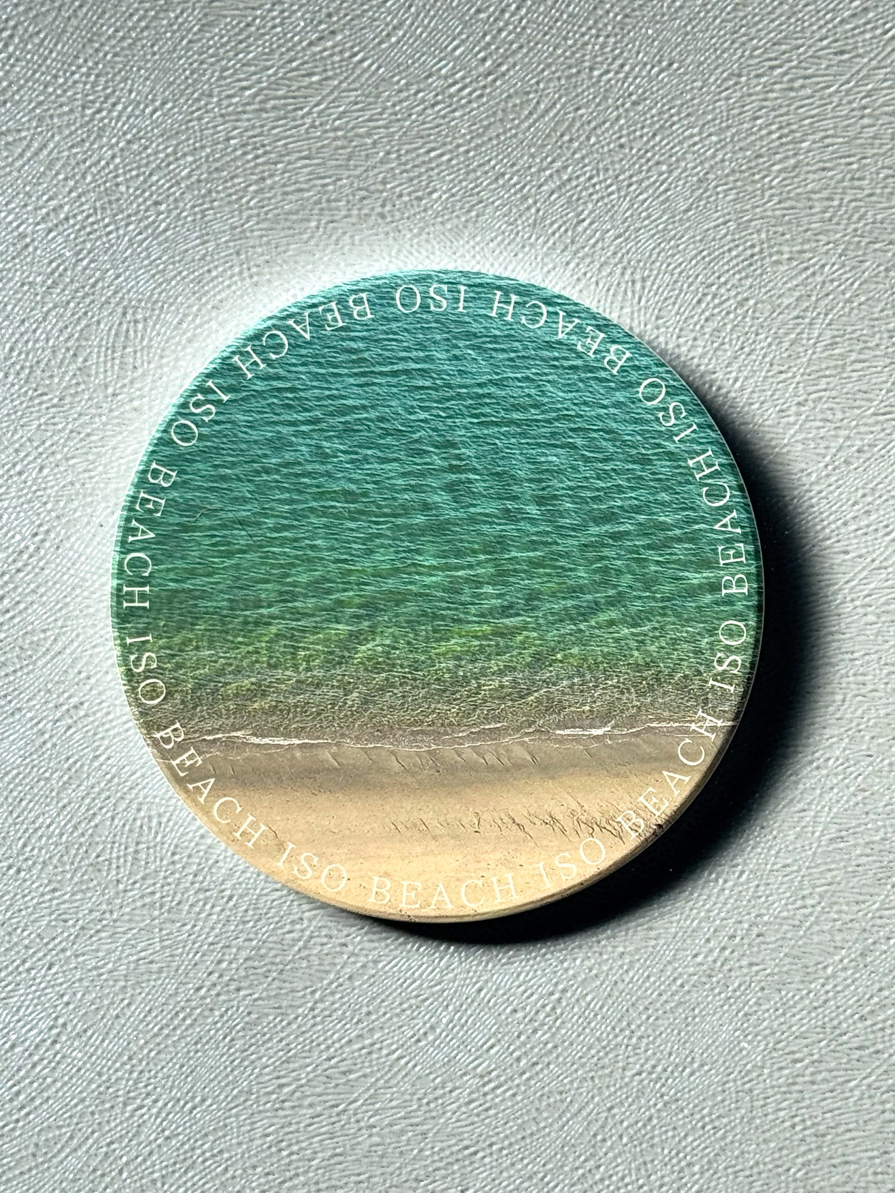 吸水性に優れ、裏面はコルクで滑りにくい白雲石コースターを使用。日差しを浴びて輝き透き通った磯の海を印刷しました。