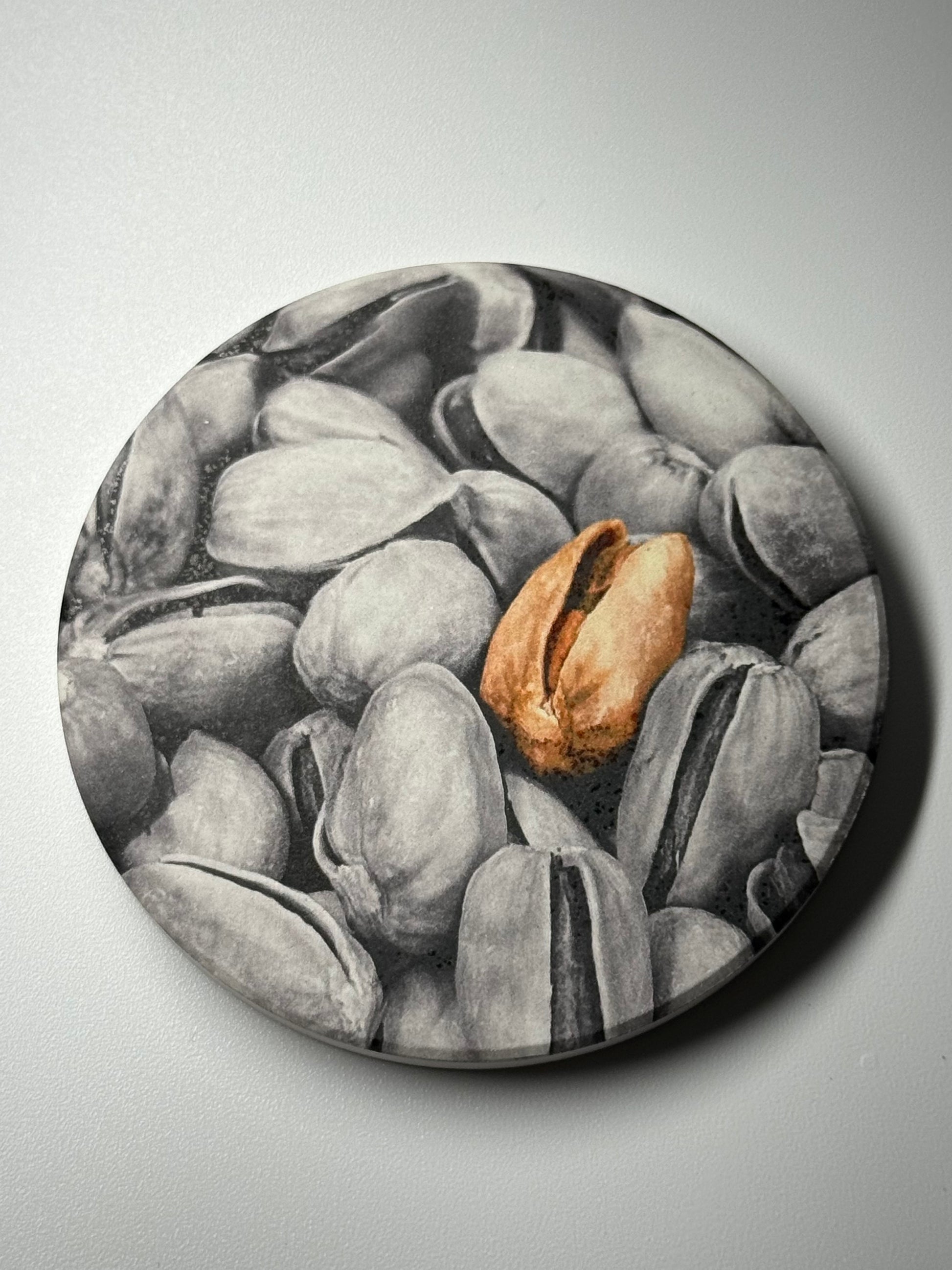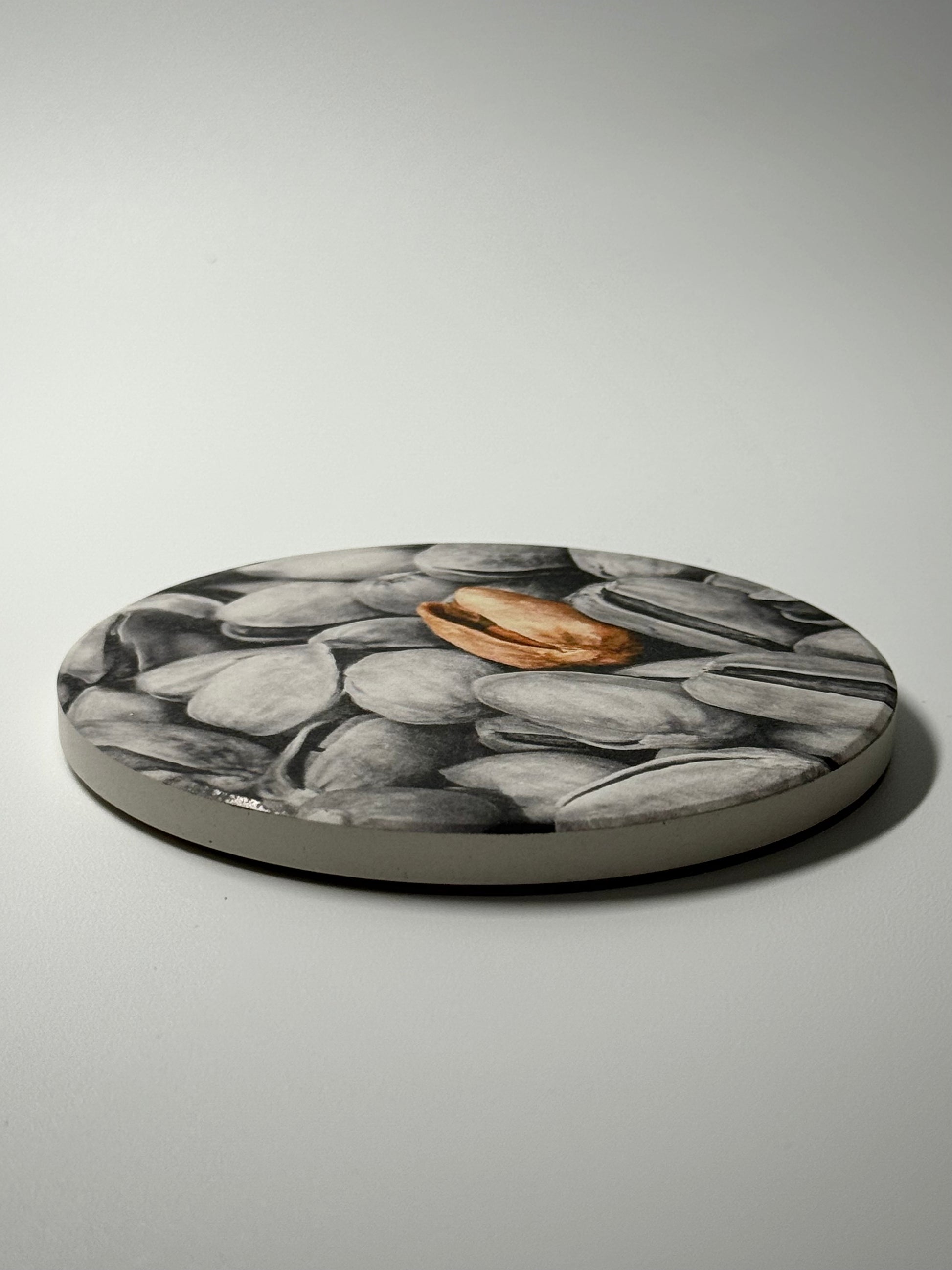 吸水性に優れ、裏面はコルクで滑りにくい白雲石コースターを使用。モノトーンをベースにワンポイント色を添えて、シックさとカジュアルさを兼ね備えました。どんなグラスにも合わせやすく、日常使いにぴったりです。