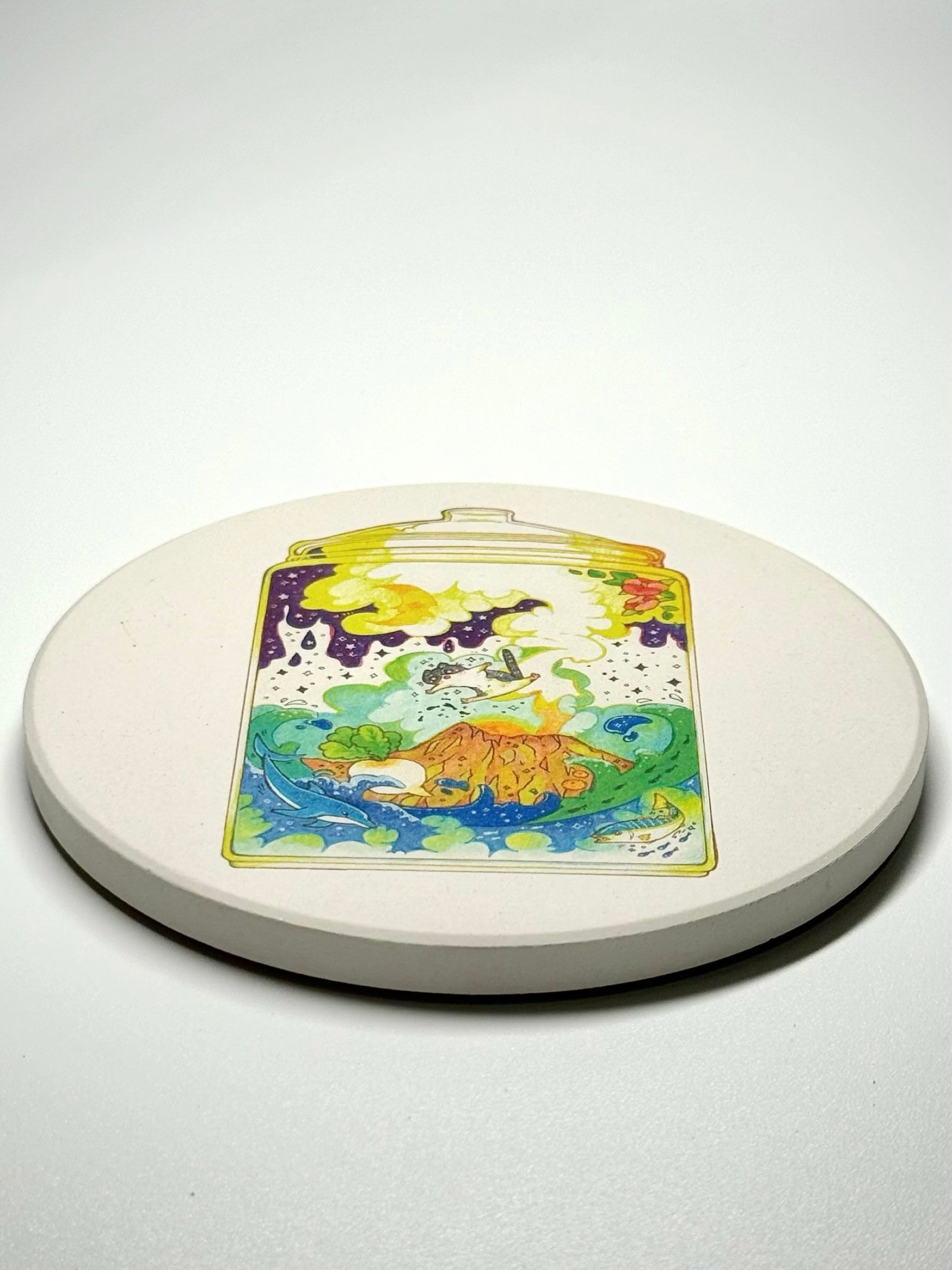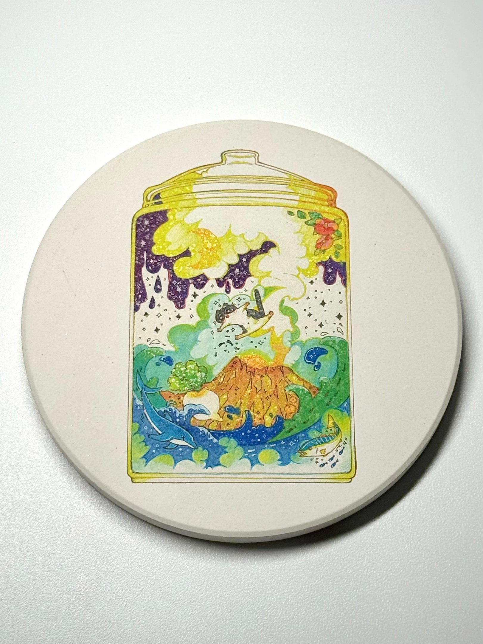 吸水性に優れ、裏面はコルクで滑りにくい白雲石コースターを使用。瓶の中に広がるキラキラと輝く桜島の世界に癒されます。イーゼルに飾っても可愛い一枚です。