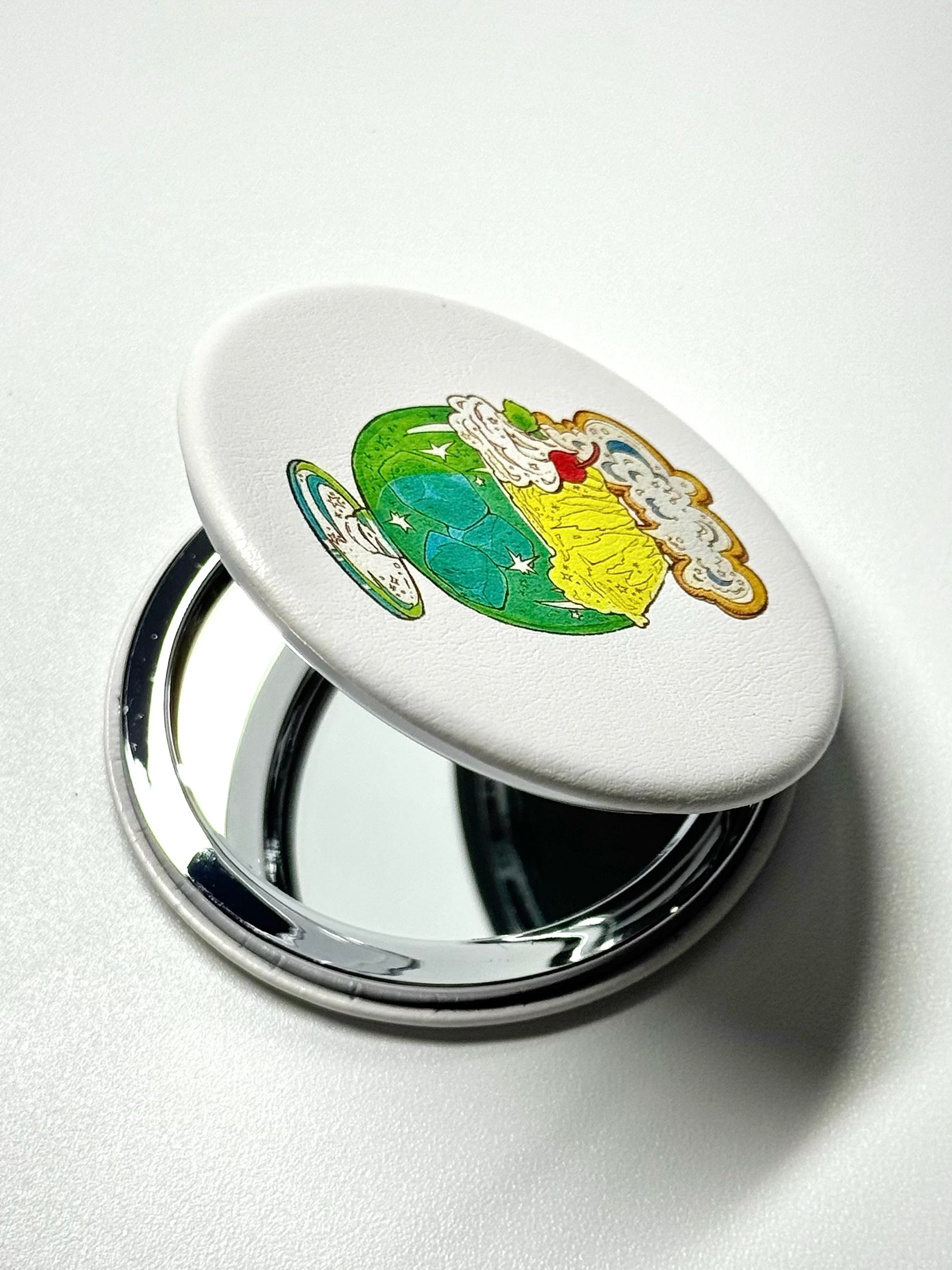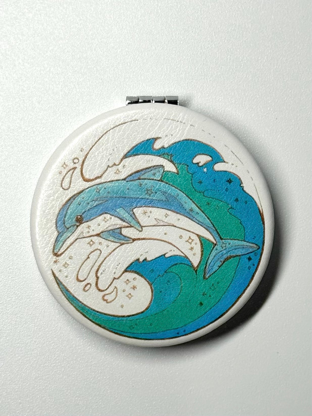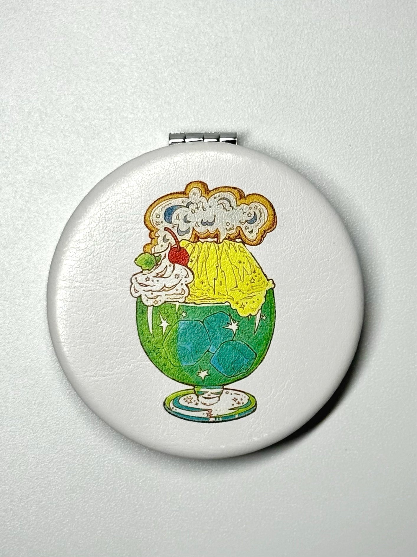 小さなバッグにもすっと収まるコンパクトミラー。表面にはレトロかわいい桜島クリームソーダ、裏面には錦江湾で元気に飛び跳ねるイルカのイラストが印刷されています。